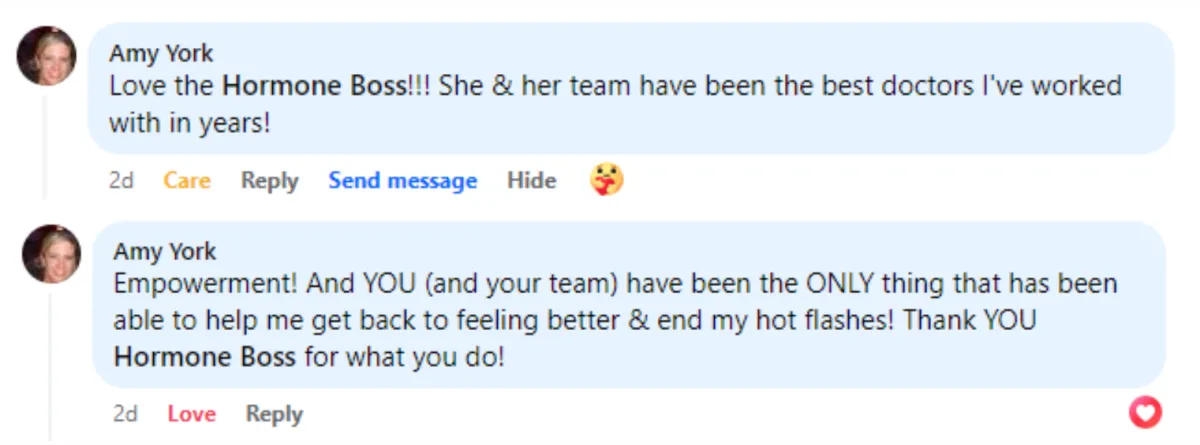 " Before Hormone Boss, midlife felt exhausting. Mood swings and fatigue were constant. Now, empowered by Hormone Boss, I've reclaimed vitality. Their personalized approach transformed my life. Thriving, not just surviving. "